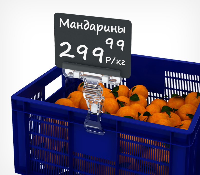 Держатель  легко крепится на товар, край корзины или на трубчатое торговое оборудование (макс. диаметр 32 мм.) Ширина захвата - 80 мм., толщина вставки - до 6 мм. Может использоваться с грифельными табличками, бумажными, картонными, вставками из ПВХ и другими информационными носителями.