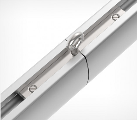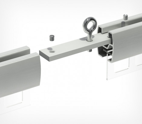 Металлическая петля-соединитель крепится в верхнем пазе профиля, фиксируется в профиле поворотом винта-петли, а также двумя потайными винтами. Такое крепления позволяет объединять 2 профиля в более длинную конструкцию. Петля-соединитель UNI-JOIN также может использоваться как усиленная подвесная петля при общем весе профиля с подвешенными рамками или плакатом более 10 кг.
