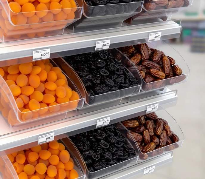 Контейнер SPACEBOX применяется для размещения и удобной выкладки развесных и мелких продуктов на прямых и наклонных полках торгового оборудования